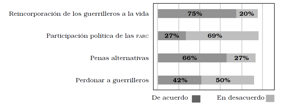 En una encuesta realizada por Cárdenas (2013) se abordan las actitudes e imaginarios de los bogotanos frente al proceso de paz. Para los propósitos del presente análisis se destaca la respuesta a la pregunta: “Ante un eventual pacto entre el gobierno y la guerrilla estaría usted de acuerdo con…” (véase Gráfica 1).