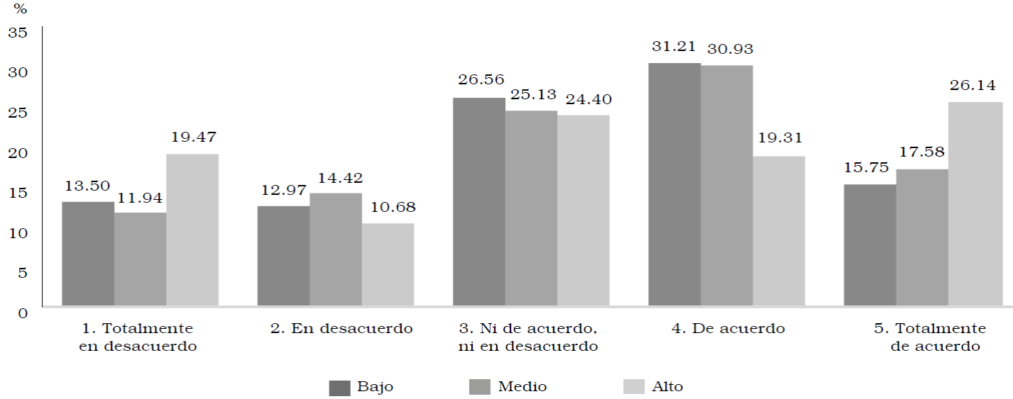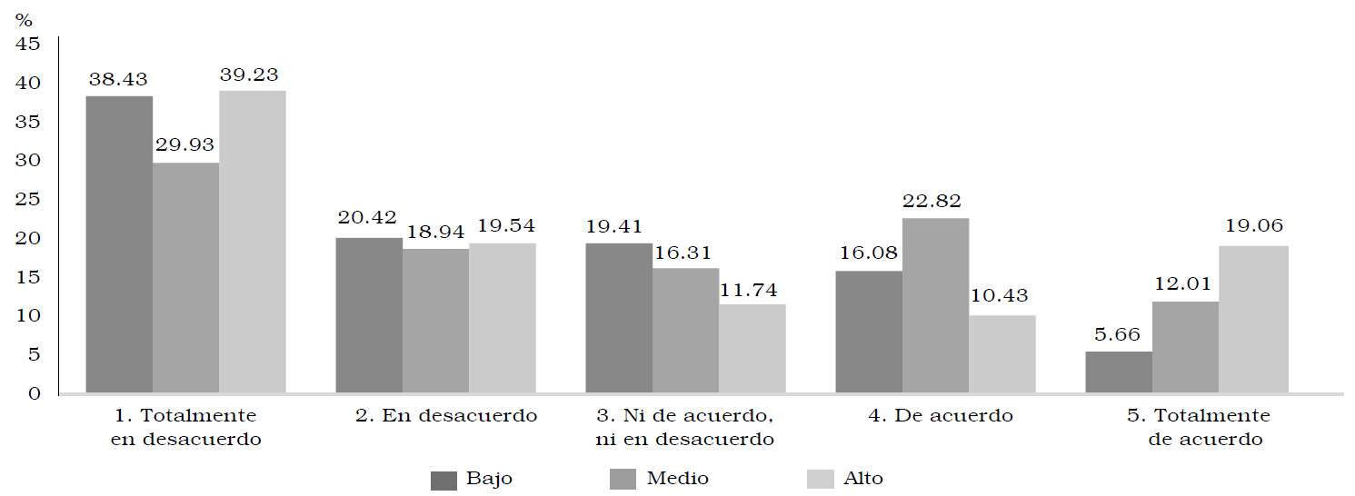 Los resultados que se registran en la Gráfica 2 exhiben que el mayor porcentaje de quienes se encuentran totalmente de acuerdo con la idea de tener a un desmovilizado como vecino (26.14%) son los encuestados de estrato alto. Pero también el estrato alto tiene el mayor nivel de desacuerdo (30.15%) frente a la posibilidad de tener a un desmovilizado de las FARC como vecino. A su vez, el estrato medio cuenta con la mayor cantidad de personas (48.51%) con algún nivel de acuerdo frente a la posibilidad de tener a un desmovilizado como vecino y menor nivel de desacuerdo (26.36%).