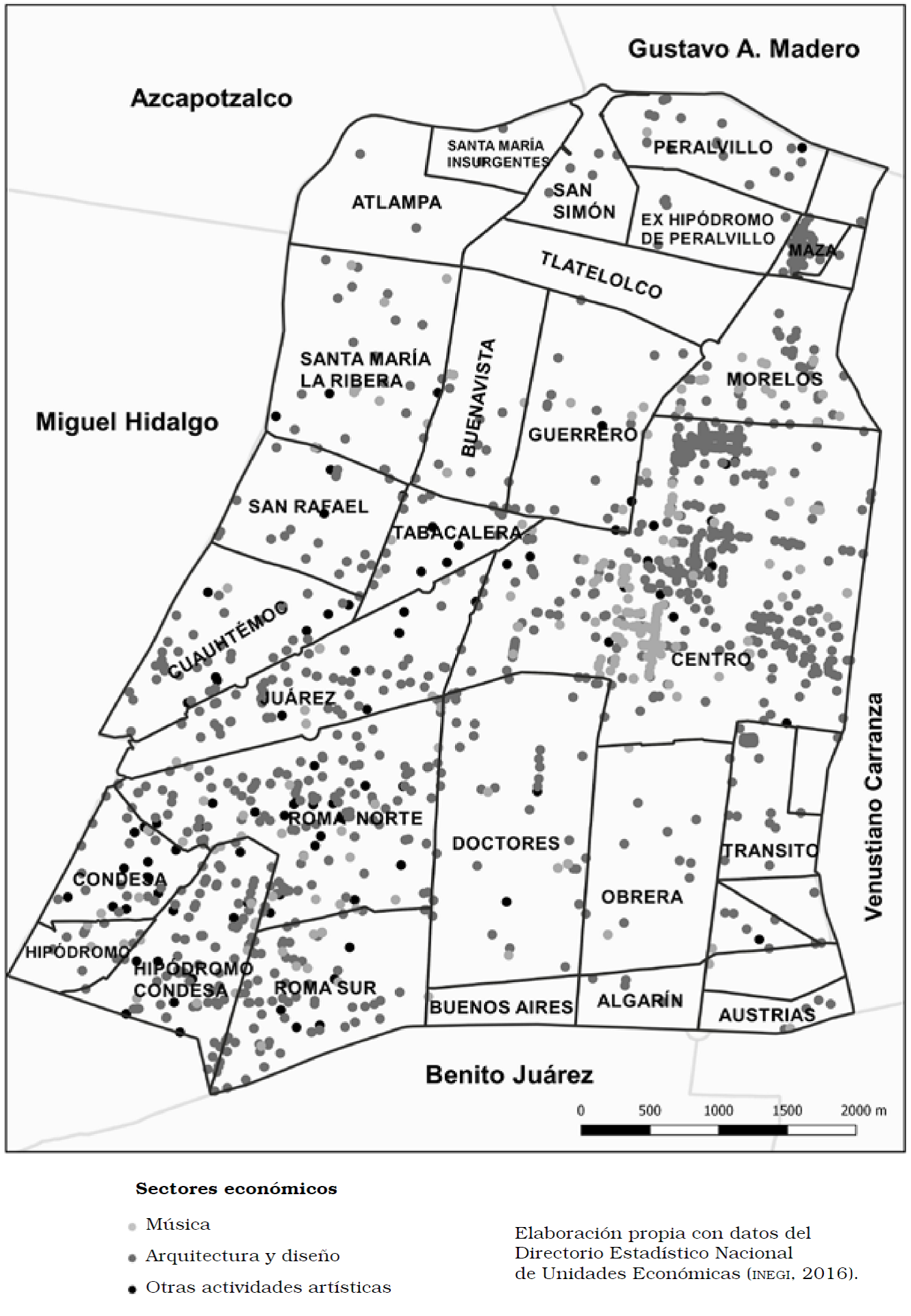 Por su parte, los métodos cuantitativos tuvieron un carácter complementario y estuvieron dirigidos a definir operacionalmente a los llamados profesionistas culturales o creadores por la Clasificación Mexicana de Carreras. Con base en datos estadísticos7 se demostró la importancia de la Roma-Condesa como área de concentración cultural, atendiendo a los establecimientos, actividades e individuos clasificados por su profesión como culturales y creativos. En el Mapa 1 se muestra la concentración de los tres grupos seleccionados de creadores y otras actividades artísticas en la antigua delegación Cuauhtémoc (hoy denominada alcaldía) que corresponde a la zona central de la Ciudad de México (véase Mapa 1). Los datos censales y de encuestas nacionales, y su georreferenciación, nos permitieron probar que, en efecto, la Roma-Condesa es una de las áreas de mayor concentración cultural de la Ciudad de México y que este fenómeno va de la mano del crecimiento desbocado de estas actividades y de los creadores entre la población ocupada de profesionistas en la primera década del siglo. Las razones más profundas que los atraen hacia estos lugares nos remiten, otra vez, a los estudios particulares de los tres grupos de creativos destacados. Por límites de espacio, no incluimos aquí esta parte del análisis.8