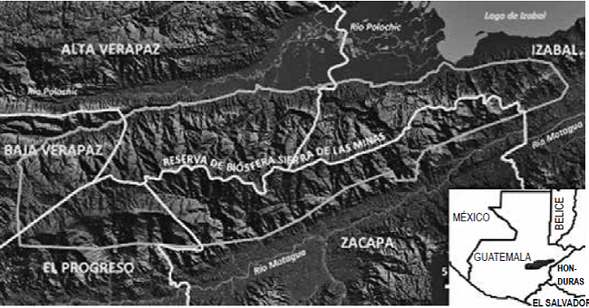 La Reserva de la Biósfera de la Sierra de las Minas, con una extensión de 242.642 ha, se ubica al oriente de Guatemala, en las coordenadas 15°04’ a 15°20’ norte; 89°18’ a 89°44’ oeste. Según Parkswatch (2002), se trata de una cordillera que protege el bosque nuboso mejor conservado de Mesoamérica; se extiende en sentido suroeste-noreste, atravesando los departamentos de Alta y Baja Verapaz, El Progreso, Izabal y Zacapa (concentrándonos aquí en los dos primeros) (fig. 1). Su aislamiento geográfico y las diversas altitudes, que van desde los 150 hasta más de 3 000 metros sobre el nivel del mar, han dado lugar a una gran diversidad de hábitats de flora y fauna (885 especies de mamíferos, aves y reptiles equivalentes al 70 por ciento de todas las especies registradas en Guatemala y en Belice) (Parkswatch, 2002). Además, ha representado históricamente una zona de refugio para diversos pueblos como los mayas, acalás, lacandones e itzaes.