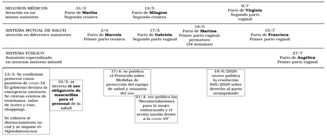 En la figura 1 se sitúan en orden cronológico según la fecha de los partos y tipo de prestador de salud las principales características de las entrevistadas en relación con los principales hitos de las políticas de gestión de la pandemia vinculadas al parto.