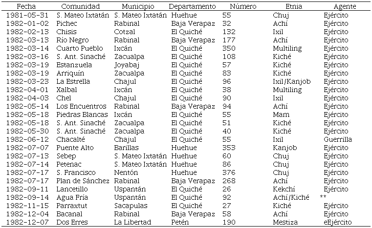 Dejamos a don Mateo y miramos esta lista de masacres con nombres desconocidos, tal vez, pero que señalan puntualmente la estrategia del ejército de destruir los núcleos que eran base de la población indígena (véase cuadro 1).