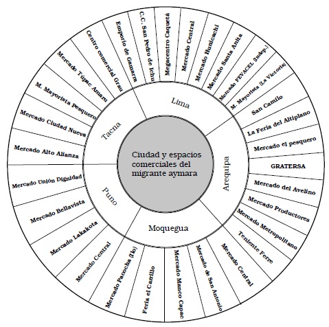 Algo semejante ocurre en la ciudad de Arequipa que acoge a una gran cantidad de migrantes puneños, en un principio los aymaras se asentaron en el distrito de Paucarpata (Arequipa), por encontrarse allí la antigua carretera de ingreso que provenía del departamento de Puno; ellos emprendieron su actividad comercial en diferentes mercados de abastos como San Camilo, la feria del Altiplano, el mercado el Pesquero, GRATERSA o mercado El Avelino. Es conveniente acotar que los pobladores de Ilave, Juli, Pomata, por la ubicación geográfica de las comunidades de origen, migraron en mayor cantidad a la ciudad de Tacna, iniciando pequeños negocios en mercados locales tales como el Mercado Central Alto de la Alianza, Ciudad Nueva, Pesquero, Túpac Amaru, Centro Comercial Grau. En cambio, los pobladores del distrito de Chucuito, Platería y Ácora migraron masivamente a la ciudad de Moquegua, desarrollando la actividad comercial en el mercado de San Antonio, Central, Manco Cápac y feria el Carrillo. En la figura 3 se ilustra los espacios comerciales mencionados.