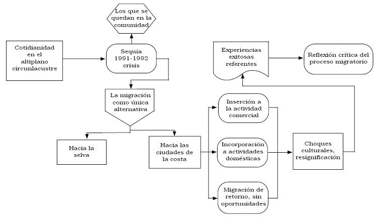 El fenómeno migratorio altiplánico es comprendido como un proceso histórico propio de la relacionalidad temporal con los valles interandinos, esto se evidencia en el control vertical de pisos ecológicos y de los archipiélagos de la costa, que garantizaban la seguridad alimentaria en tiempos de calamidad, bajo términos homogéneos y de horizontalidad entre sociedades establecidas en los distintos nichos ecológicos. Sin embargo, la migración aymara de 1991-1992 fue forzosa debido a la prolongada sequía, pues la variación climática cambió sustancialmente la lógica primaria de la migración, que se dio con fines de aprovisionamiento de alimentos, causando que los migrantes ingresaran a un espacio urbano con predominio de flagrantes desigualdades sociales, ajenas al paradigma aymara. Los movimientos migratorios se reflejan en una movilidad humana hacia los centros urbanos de la costa peruana como: Arequipa, Tacna, Moquegua y Lima; en busca de espacios de inserción laboral en el comercio informal o en el subempleo.