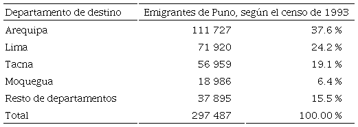 En cuanto al flujo migratorio, el censo nacional 2017 del INEI resalta que, del total de población censada, 20.3 por ciento nació en otro departamento, esto representa 5 961 295 personas, en el quinquenio 2012-2017. El departamento de Lima atrajo a 511 186 inmigrantes (35.7 por ciento, seguido por la Provincia Constitucional del Callao con 94 272 personas, que equivale a 6.6 por ciento y el departamento de Arequipa atrajo a 90 638 inmigrantes, lo que representa el 6.3 por ciento (INEI, 2018: 40). El movimiento demográfico poblacional es considerado como “el fenómeno social que implica el desplazamiento de la población generalmente del campo a la ciudad capital o de mayor desarrollo” (Suxo, 2007: 104), coligiendo que el poblador altiplánico es quien resalta a nivel nacional como uno de los principales emigrantes, con seis por ciento de la población nacional peruana en tránsito.