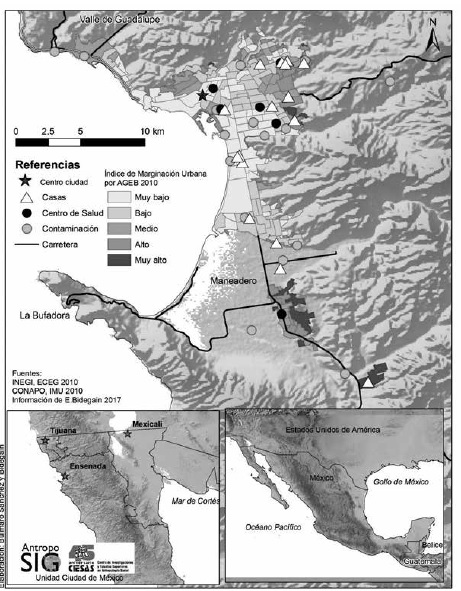Las principales causas de fallecimiento en Baja California son enfermedades del corazón, tumores malignos (del estómago, cuello del útero, próstata y mama), diabetes y accidentes de tránsito. La tuberculosis se encuentra en el decimotercer lugar de causa de mortalidad en el estado y, según datos del Instituto Nacional de Estadística y Geografía (INEGI), la más alta por más de diez años de todo México (INEGI, 2015 y 2017). Entre 2010 y 2016, en la ciudad de Ensenada, la tuberculosis pulmonar afectó sobre todo a personas entre 20 y 34 años y después entre 45 y 64 años; la mayor frecuencia se registra en varones. El Hospital General y el Hospital del Instituto Mexicano del Seguro Social fueron los que más diagnosticaron casos nuevos. Los centros de salud que más pacientes bajo tratamiento tuvieron entre 2010 y 2016 (véase figura 1) se ubican en zonas con carencias de servicios públicos tales como vialidades en buen estado, frecuencia de transporte público, recolección de residuos y acceso al agua corriente sin cortes frecuentes. Sólo dos de estos centros de salud están en el centro de la ciudad.