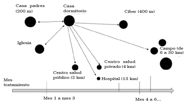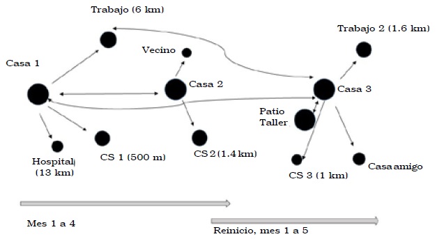 La movilidad de residentes establecidos y entre lugares fuera del centro de salud y la casa ha sido asociada a las restricciones dadas por las condiciones de trabajo, la situación migratoria y los retrasos en la consulta biomédica oportuna o a continuar los tratamientos (Goldberg, 2010, 2013 y 2014). La casa es también el lugar de trabajo (casas talleres o campamentos agrícolas) y es una situación similar a la observada en los pacientes que implementaron talleres de mecánica, carpintería o de venta ambulante en el exterior de la casa.