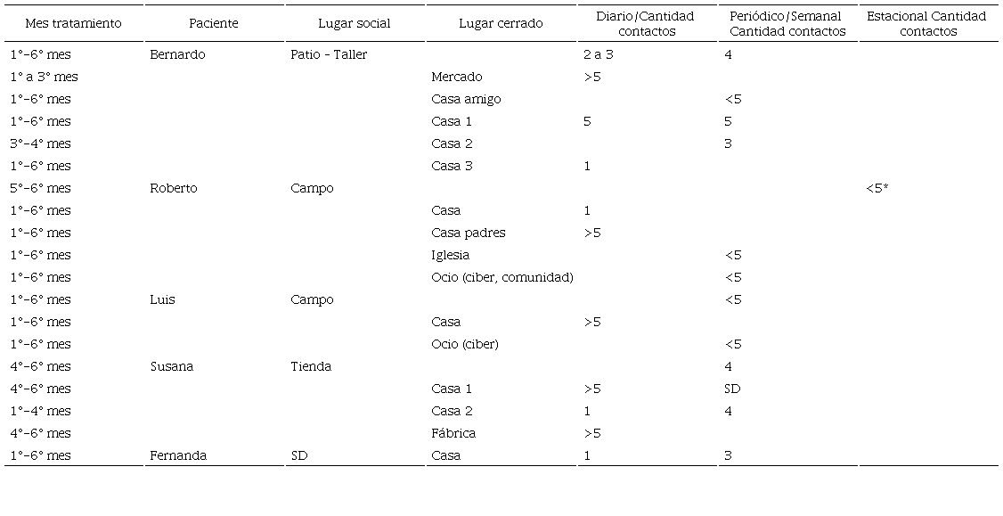 Una vez que una persona es diagnosticada con tuberculosis, se promueve el relevamiento de los contactos frecuentes de la persona dentro y fuera de la casa.2 Los centros de salud sólo registraron los contactos con los que compartían casa los pacientes bajo tratamiento que seguimos en este estudio. No aparecían otros contactos frecuentes que eran parte de dinámicas de reciprocidad, convivencia entre parientes y de actividades de subsistencia, donde participan vecinos, amigos, compañeros de trabajo o, incluso, proveedores de servicios como tiendas de abarrotes, agua potable o clientes, en el caso de quienes están en el comercio legal o ilegal. Tampoco los contactos que cambian a causa de las mudanzas cuando inician el tratamiento (véanse cuadro 1 y figuras 2 y 3).