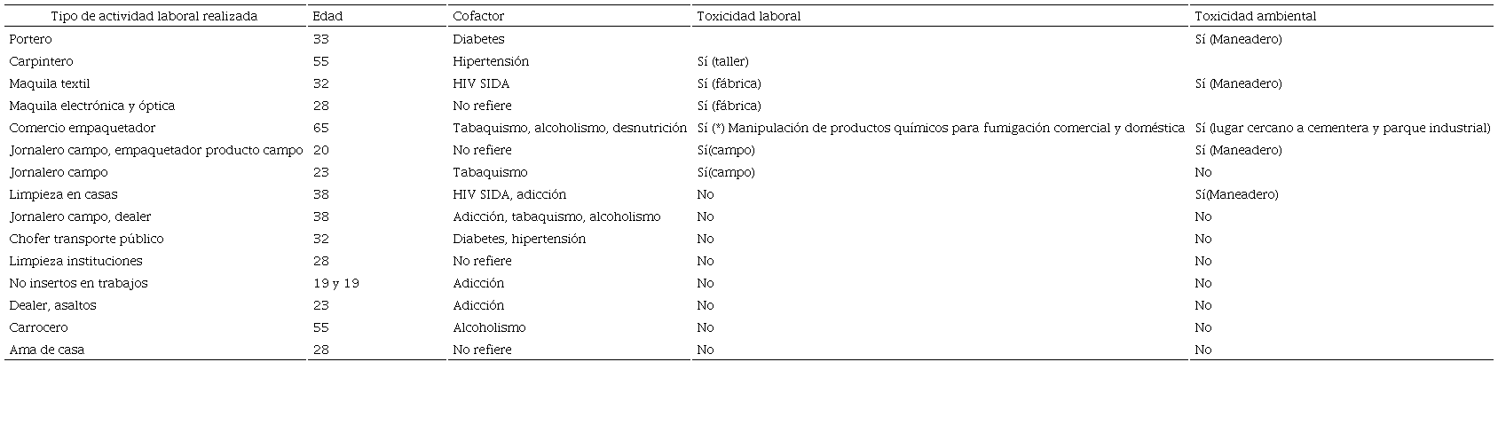 Hay tres cementeras y dos parques industriales en zonas residenciales de Ensenada, y en Maneadero predominan las agroindustrias y vinícolas en Valle de Guadalupe. En las narrativas de los pacientes aparece la percepción de contaminación del aire en el campo, en la fábrica de maquila o alrededor de sus casas ubicadas en zona de campos (véase cuadro 2). De los 16 pacientes entrevistados, aquellos que se encontraban trabajando (ocho de ellos) meses previos al diagnóstico de la enfermedad refirieron que percibían toxicidad ambiental o laboral. Mientras que los restantes ocho no lo hicieron; de ellos, sólo uno trabajó en el campo y el resto en un taller de carrocería, limpieza de instituciones y como chofer de transporte urbano. De igual manera opinaron aquellos sin experiencia laboral formal o que se dedicaban al consumo y venta de drogas como dealers.