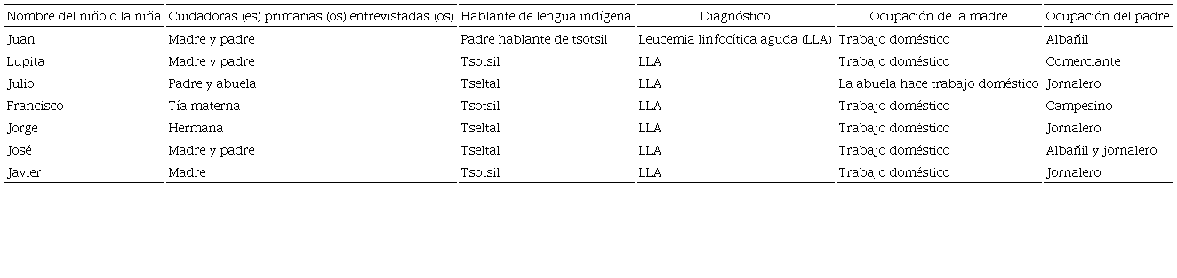 En todas las familias encontramos que las cuidadoras (madres, abuela, tía y hermana) también se dedican al trabajo doméstico;4 sólo en un caso la hermana trabajaba como empleada doméstica para ayudar con los gastos del tratamiento del hermanito; en otro caso la abuela cuidaba al niño porque los padres se separaron mucho antes del diagnóstico y no se han vuelto a ver. Todos los padres, salvo uno, realizaban trabajos de baja remuneración (máximo 100 pesos al día) como jornaleros o albañiles, cuatro también trabajaban su propia tierra. El que se dedica al comercio es el único que contaba con ahorros al momento del diagnóstico de su hija, los demás hicieron préstamos que oscilaban entre 5 000 y 21 000 pesos al comenzar la búsqueda de atención médica. La mayoría de los informantes no había concluido sus estudios básicos, salvo el comerciante que terminó la preparatoria (véase cuadro 1).