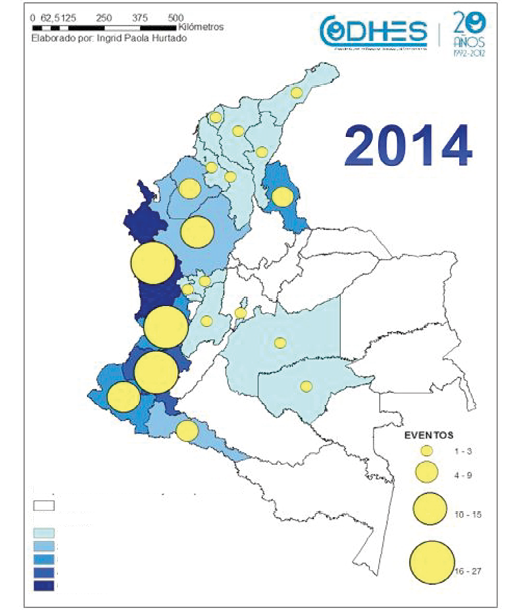 Quizá uno de los fenómenos más dramáticos que denotan la asociación entre órdenes territoriales y geografías de la guerra es el del desplazamiento forzado. En aquellos departamentos donde se registra una presencia numerosa de grupos armados son más recurrentes este tipo de hechos victimizantes. El mapa de CODHES para el año 2014 permite identificar las regiones del país con mayor número de eventos. Estos territorios coinciden con los registros gubernamentales sobre presencia de más de dos actores armados.
