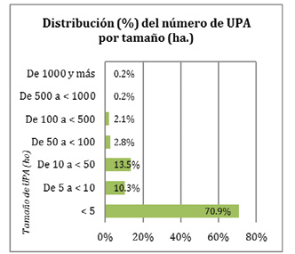 En este país, según datos revelados por el Departamento Administrativo Nacional de Estadística (DANE), el 0,4% de las unidades de producción agropecuaria representan el 42% del área censada, con unas extensiones que superan las 500 hectáreas. Y el 70% de las Unidades de Producción Agropecuaria del país (UPA), con extensiones de menos de 5 hectáreas representan el 5% del área censada.