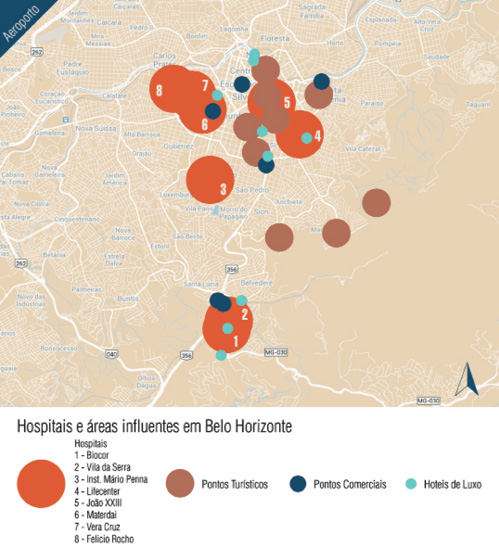 A Figura 3 mostra os principais centros hospitalares de Belo Horizonte que consideramos como de alta complexidade. Observa-se na imagem a mesma lógica existente em São Paulo e Rio de Janeiro: a escolha por áreas nobres, bem servidas de serviços e infraestruturas urbanas e, principalmente, de equipamentos turísticos e culturais.