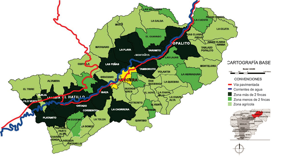 Con relación a lo anterior, el aumento de las extensiones destinadas a las fincas de recreo en la parte baja del municipio (cota de 1.300 msnm como altura máxima aproximadamente, cerca de la cabecera municipal, de las vías principales y del río Porce) generó el desplazamiento de la agricultura y de la ganadería, y ocupó para fines turísticos las que en su momento fueron las tierras más fértiles (véase Figura No. 2).