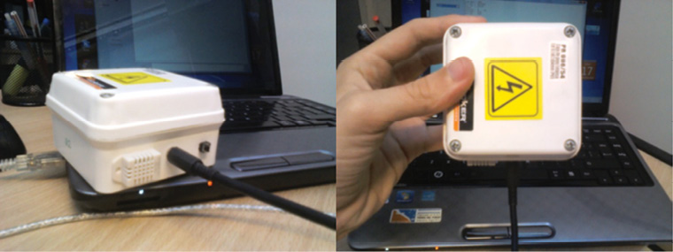 Se diseñaron estaciones de monitoreo de alta frecuencia para el estudio del confort en la ciudad de Bahía Blanca. Las mismas estuvieron constituidas por una caja plástica que recubrió los sensores de temperatura y humedad relativa, junto con una fuente de alimentación de energía (pilas). En la parte inferior se localizó una red plástica que contuvo los sensores y permitió la circulación del aire. Al lado de esta se incorporó un adaptador para conectar cada estación con una computadora portátil. De esta forma, se descargaron datos y se reiniciaron las mediciones dado que cada dispositivo tiene una capacidad de almacenamiento limitada (500 Mb) (Ferrelli, Vitale y Piccolo, 2015) (véase Figura 1). El error del sensor de temperatura fue de 0,1ºC y el de humedad relativa de 1%.