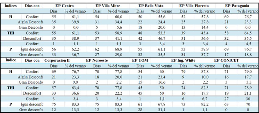 El THI identificó a Villa Floresta, UOM, Bella Vista y Villa Mitre como las zonas más desconfortables con un 56,6%, 50%, 46,7% y 41,1% de los días de verano desconfortables, respectivamente. Un segundo grupo lo representaron el centro, Patagonia y Cooperación II con un 30% y 40% de días con desconfort. Finalmente, las regiones confortables, que presentaron menos del 20% de los días con desconfort, fueron Ing. White y CONICET (véase Tabla 3).
