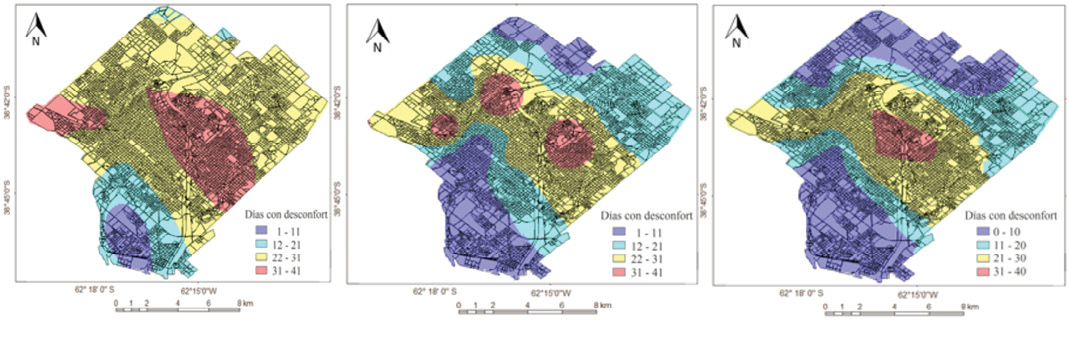 El análisis de estos índices se realizó de forma estacional, mensual y diaria. Se estudió el número de días con desconfort y la intensidad de los mismos teniendo en cuenta la valoración cualitativa de cada índice. Los resultados fueron procesados con el Software ArcGIS 9.3. Se aplicó el método de interpolación Kriging ordinario de tipo esférico para representar los valores medios de verano e invierno con cada uno de los índices. Además, se realizaron mapas con el número de días con desconfort. Esta información fue útil para zonificar la ciudad de Bahía Blanca e identificar las áreas con menor confort.