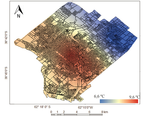 A partir del estudio del confort invernal utilizando el índice TE se identificó que el centro y centro-este de la ciudad presentaron mayor confort. Las zonas más frías se localizaron en el norte y noreste. El mayor valor de TE se registró en el centro con 9,6ºC y el menor en Patagonia con 6,6ºC (véase Figura 7).