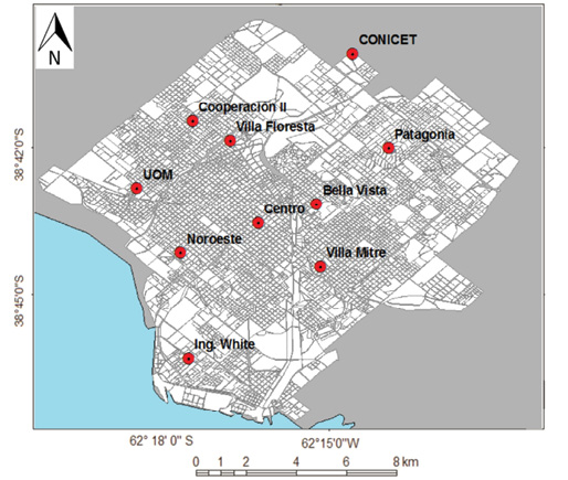 El confort se calculó con datos de un total de diez estaciones localizadas en distintos barrios de la ciudad de Bahía Blanca (véase Figura 2) y se denominaron de acuerdo con el nombre del barrio en el que se las localizó. Tuvieron una frecuencia de muestreo de 30 minutos y el período de estudio comprendió 408 días, comenzando en octubre de 2013 y finalizando en diciembre de 2014. Por cada estación se obtuvo un total de 19.584 datos. Los mismos fueron filtrados y analizados con el Software Matlab. La estación localizada al noreste (denominada CONICET) estuvo además equipada con sensores para medir el viento, parámetro necesario para el cálculo de algunos índices de confort.