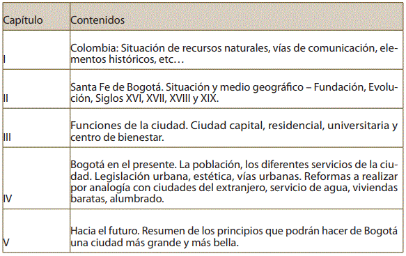 A diferencia de Martínez, Brunner no puede demostrar un conocimiento específico del caso bogotano. Sin embargo, como se pudo ver, tampoco es algo que Martínez considerara fundamental, especialmente, teniendo en cuenta su interpretación, en ocasiones contradictoria, de la funcionalidad de la historia para el urbanismo. Sin embargo, Brunner cuenta con un largo currículo en la realización de planes directores, entre los cuales se destaca su más reciente realización en Santiago de Chile, experiencia que se había difundido ampliamente gracias la publicación de uno de los primeros libros sobre urbanismo latinoamericano en español (Brunner, 1932), cuya portada e índice se pueden ver en la Ilustración 2. Del mismo modo, la trayectoria de Brunner logra ajustarse de manera adecuada a los intereses que, desde el Concejo Municipal, se habían manifestado sobre lo que debía ser el trabajo de un urbanista para la ciudad de Bogotá. Según se expresa en el documento que expone la justificación oficial de la contratación de Brunner,