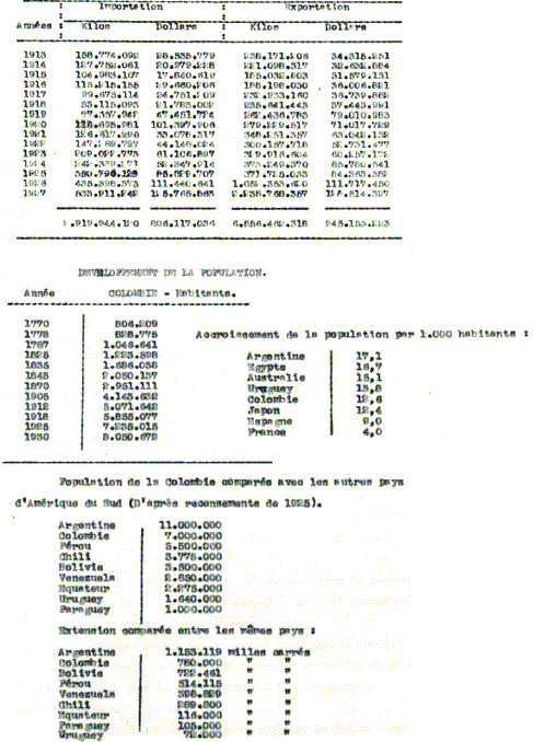 Las tablas expuestas por Martínez hacen referencia al movimiento de exportaciones e importaciones, al crecimiento de la población, a la extensión del país en comparación con los países de América Latina y al crecimiento de la población con relación a otros países del mundo. Mediante estas, Martínez busca justificar la hipótesis de que Colombia debe liderar el movimiento de América del Sur hacia la “civilización” (Martínez, 1930: 7).