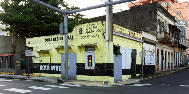 Entre 2015 y 2016, un gran proyecto sacude a Puerta de Tierra, el barrio que se divisa como antesala del Viejo San Juan (Puerto Rico). Mientras se construye un paseo faraónico paralelo al mar, los edificios, las calles y las aceras de la comunidad se deterioran a pasos agigantados. Los automóviles y autobuses circulan cada vez más rápido ante la ausencia de semáforos y los transeúntes intentan mantenerse a salvo como un acto más de su día a día. El abandono de muchos edificios provoca inseguridad y malestar. La ausencia de espacios públicos hace eco en los residentes que intentan ocupar las calles, convirtiéndolas en una extensión de sus hogares o negocios. Esto es terreno común del urbanismo noeliberal, ya que como lo explican Brenner, Peck y Theodore (2009: 9), “la neoliberalización se basa en un desarrollo espacial desigual y se materializa a través de esa desigualdad; esto es, su ‘estado natural’ se caracteriza por una topografía desigualmente desarrollada y persistentemente inestable”. Sin embargo, en algunas paredes de Puerta de Tierra pueden verse murales esperanzadores que claman “¡Aquí vive gente!”