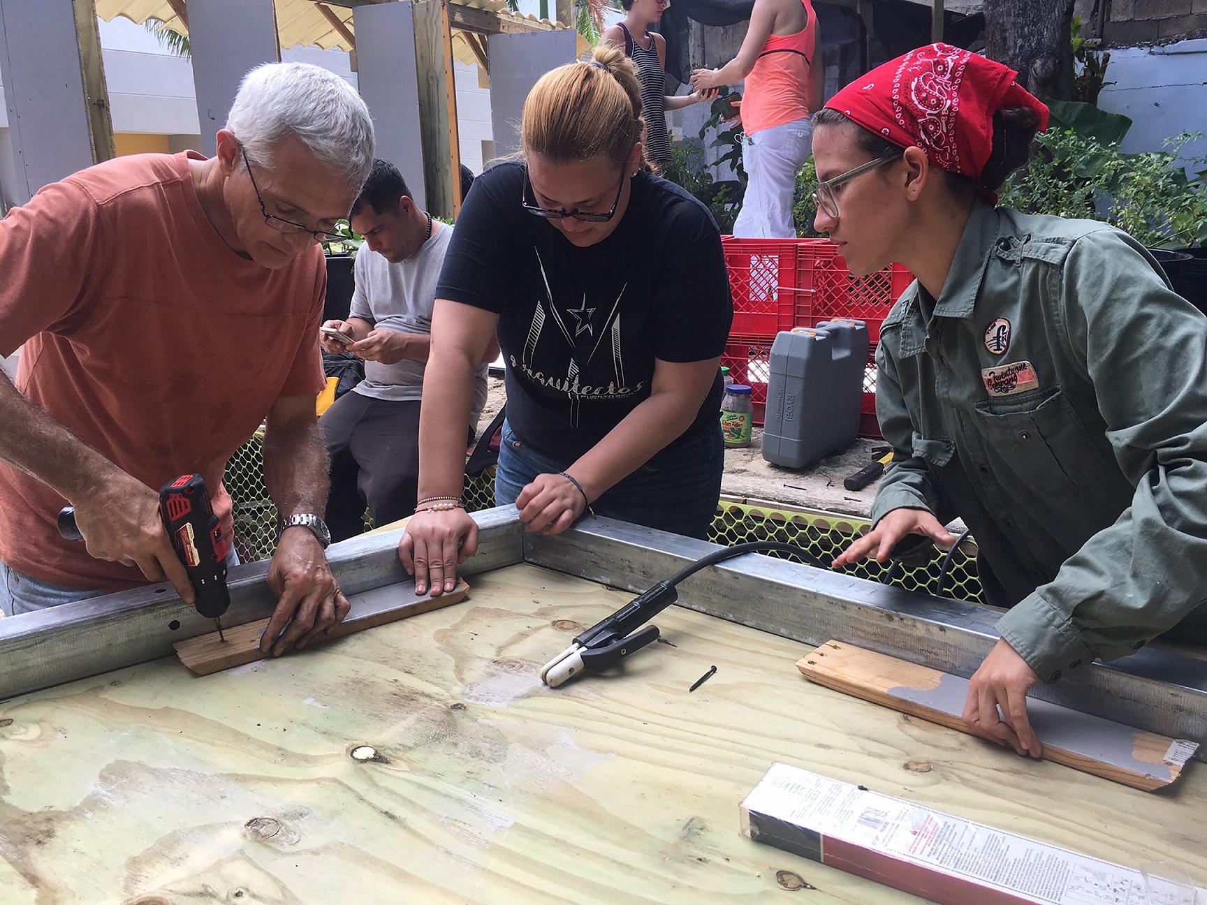 Fuente: Taller Creando sin Encargos.Las colaboraciones de los propietarios de los negocios aledaños y los residentes fueron componentes claves en el proyecto. Por ejemplo, los residentes llevaron merienda a los estudiantes, un negocio auspició unos de los almuerzos, el propietario del Colmado que se encuentra justo al lado de la Plaza Vivero nos proveyó de electricidad para la utilización de equipo como la sierra, los taladros y la soldadora y el propietario del taller de soldadura en la Calle del Tren cortó los tubos de acero. Esto demuestra la importancia de identificar los recursos y talentos de la comunidad para lograr que el trabajo fuera hecho en un ambiente realmente colaborativo.