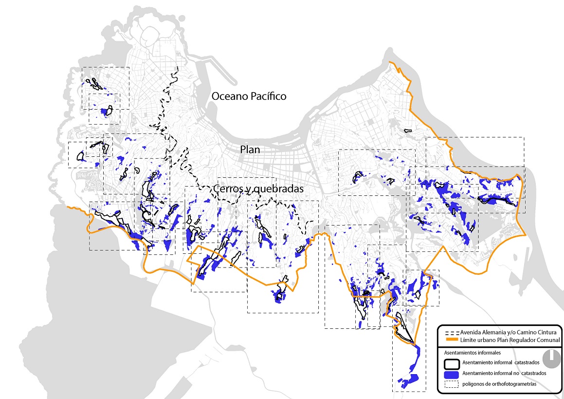 Al superponer los datos cartográficos de fuentes oficiales con los levantamientos ortofotogramétricos, se constata que la mayoría de los asentamientos informales de Valparaíso se localizan en la Zona de Interfaz Urbano Forestal (Ojeda, Bacigalupe y Pino, 2018) y se encuentran entre la cota 100 y 400 msnm, teniendo como frontera el llamado “camino de cintura” o avenida Alemania que une distintos cerros de la ciudad y que opera simbólicamente como un límite entre lo formal y lo informal, entre lo consolidado y lo no consolidado (Pino, 2015).