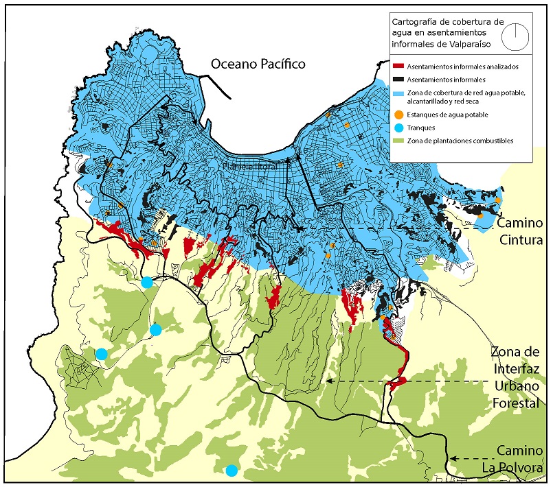 En efecto, la privatización de los servicios y el acceso desigual al agua tiene un ejemplo claro en la ZIUF, donde se emplazan los asentamientos informales de Valparaíso. Estas zonas se caracterizan por la ausencia de infraestructura destinada a canalizar, almacenar y distribuir las aguas potables, tratadas, grises y lluvias. Al mismo tiempo, la indisponibilidad de agua contrasta con la presencia de monocultivos altamente combustibles (pinus radiata y eucaliptus globulus) próximos a los asentamientos informales, que las convierten en zonas de alta vulnerabilidad ante el riesgo de incendio forestal urbano. En un país como Chile, expuesto a diversos riesgos de desastre (sismo, tsunami, incendios, aluviones, erupciones volcánicas), no deberían existir zonas sin infraestructuras urbano territoriales destinadas a mitigar la vulnerabilidad de sus asentamientos y, en una ciudad como Valparaíso, en la que la Zona de Interfaz Urbano Forestal se encuentra expuesta permanentemente a riesgo de incendio, la ausencia de cobertura de agua constituye un problema de ordenamiento territorial y medio ambiental.
