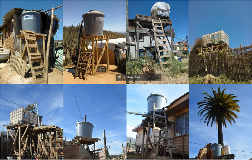 Al analizar los once sistemas urbanos presentes en la ZIUF (Figura 3) se evidencia que, en nueve de ellos, el acceso al agua se realiza por medio de pozos, vertientes, conexiones informales y compra de agua potable distribuida por el camión aljibe municipal, [15] lo cual obliga a que los habitantes tengan que autoconstruir sistemas informales de distribución y almacenamiento de agua, no necesariamente herméticos y/o bien sellados (Figura 5).