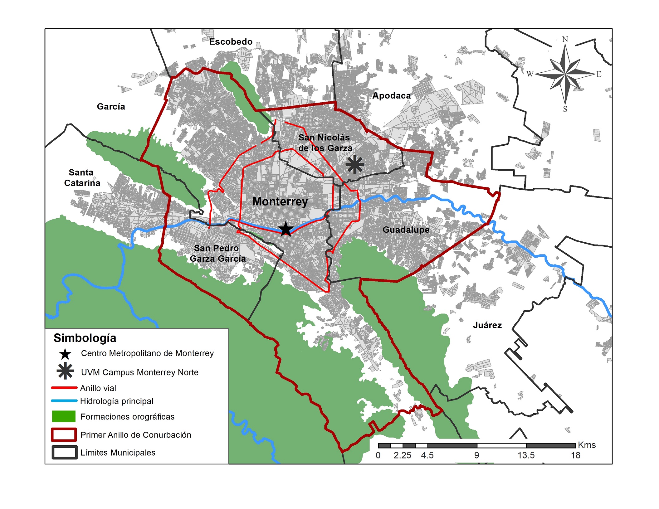 De acuerdo con el Censo de Población y Vivienda de 2010 (INEGI, 2010), la población del AMM es de casi cuatro millones de personas, cuya superficie urbanizada cubre un radio de 25 km desde el centro metropolitano, con una densidad bruta de 59.97 habitantes/Ha. La división municipal de la metrópoli es irregular en sus dimensiones y propiedades físicas (morfología), hay entidades que colindan con uno o dos municipios y otras que lo hacen hasta con cuatro. Este es el caso del municipio de San Nicolás de los Garza, que limita al oeste con la ciudad capital, al este con Guadalupe (municipios del primer anillo de conurbación) y al norte con dos entidades periféricas, Escobedo y Apodaca (González y Larralde, 2019).