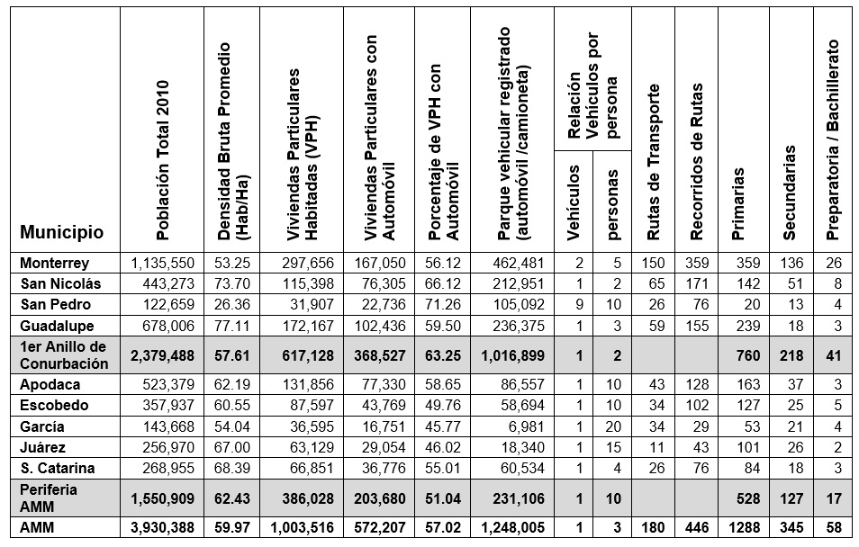 Análisis comparativo de indicadores de movilidad motorizada, población y vivienda en el AMM, 2010