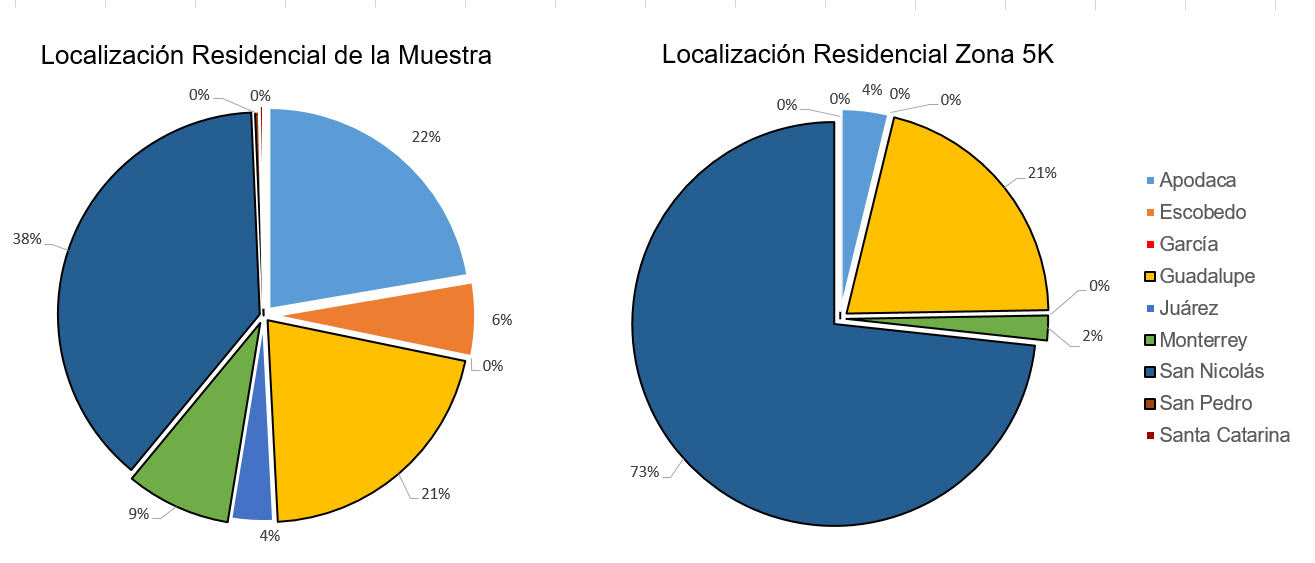 Del porcentaje de alumnos residentes en el municipio de San Nicolás de los Garza, el 73% vive en un radio de 5 km de la UVMCMN, subcentro de la zona de estudio, el cual se traza como parámetro principal de movilidad no motorizada para la obtención de los indicadores de este estudio (Figura 3).