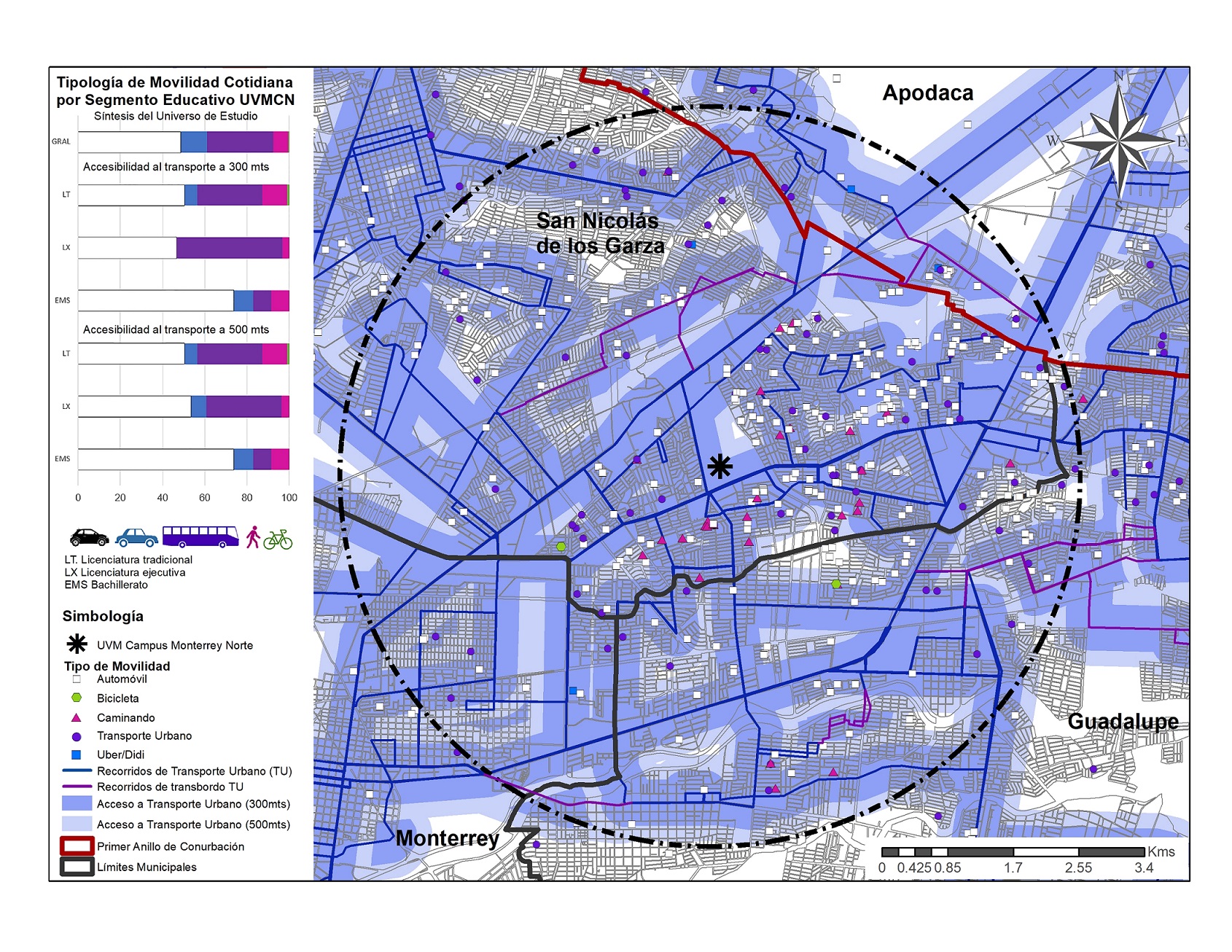 En un primer segmento de interrogantes se encuentran las de carácter locativo, que se asocian a la localización de la vivienda de los estudiantes y su proximidad a universidad. El segundo segmento busca conocer los medios de transporte utilizados por los estudiantes para llegar al campus UVM y para realizar sus actividades previas y posteriores. Los resultados con respecto al primer interrogante arrojan que el 38% de los encuestados residen en San Nicolás de los Garza, 22% en Apodaca y 21% en Guadalupe. Dichas entidades político-administrativas presentan contigüidad, lo que demuestra que el subcentro educativo de análisis tiene una jerarquía espacial de carácter metropolitano, porque atrae, indistintamente, población de municipios del primer anillo de conurbación y de la periferia.