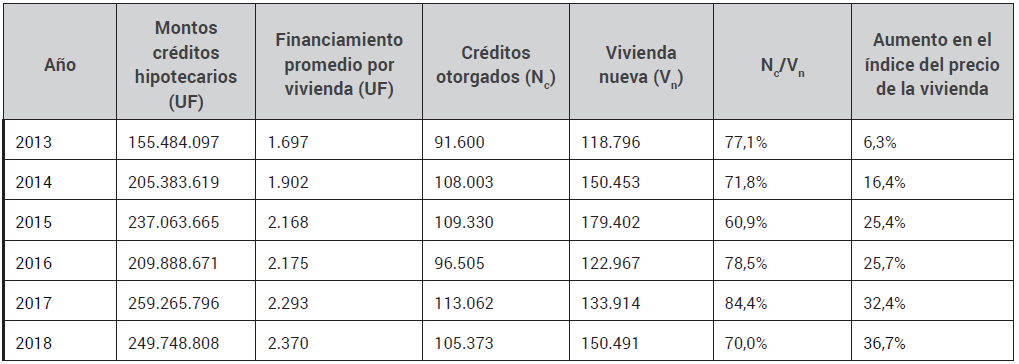 Fuente: elaboración propia con base en datos de la Comisión del Mercado Financiero y la Cámara Chilena de la Construcción.En la Tabla 2 se observa que, entre 2013 y 2018, la vivienda nueva presenta un ratio promedio de 73,8% con relación a la cantidad de préstamos hipotecarios. Es decir, si la totalidad de los créditos hipotecarios contratados fuesen destinados a vivienda nueva, la mayoría habría sido adquirida con mecanismos de endeudamiento financiero. Lamentablemente, en Chile, el registro de transacción de viviendas no es del todo transparente y los datos son de difícil acceso porque los registros oficiales se realizan, únicamente, en los Conservadores de Bienes Raíces de cada zona geográfica, a mano y en archivos descentralizados. Por esta razón, no se cuenta con los datos sobre cuántos de estos créditos hipotecarios se destinaron a la compra de vivienda usada.
