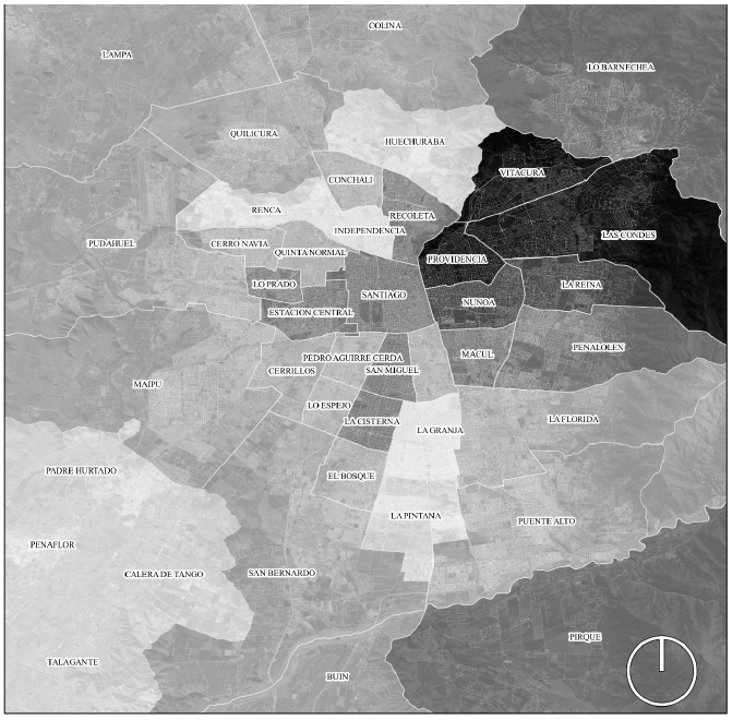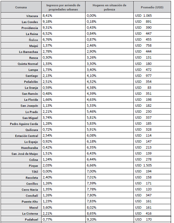 Fuente: elaboración propia con base en archivos históricos de Encuesta CASEN.Esta estrategia de capitalización de los ingresos de los hogares a partir del arriendo también está espacializada. En la Tabla 4 y en el Mapa 1 se puede constatar cómo las comunas de la Región Metropolitana de Santiago con menor concentración de hogares de escasos recursos tienen la mayor concentración de hogares que perciben ingresos por rentas de propiedades urbanas. Esto da cuenta de que el proceso de financierización beneficia, principalmente, a los sectores de mayores ingresos.