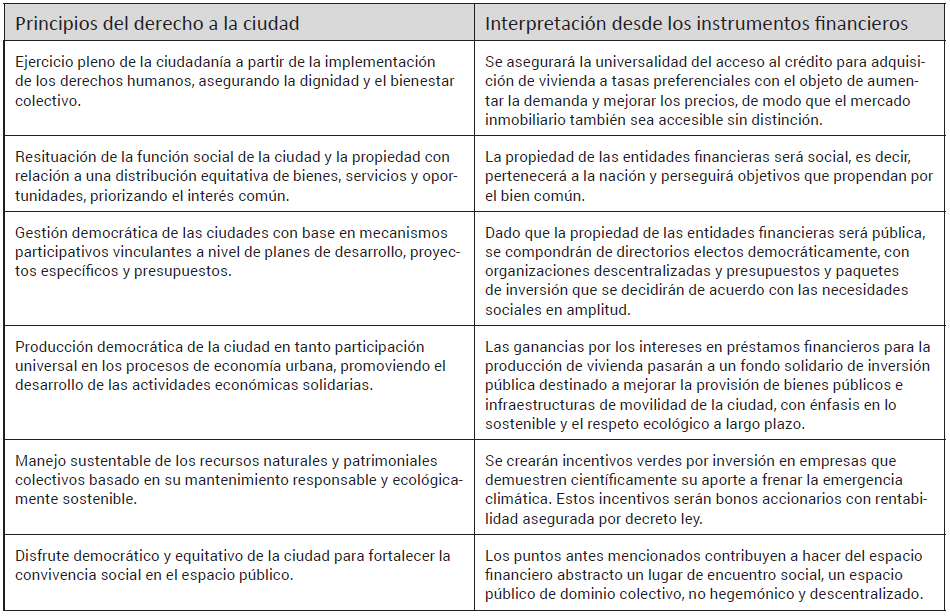 A modo de sintetizar las reflexiones que surgen desde la exploración desarrollada en este artículo, se desarrolla un cuadro que organiza algunas interpretaciones sobre la idea de un derecho a la ciudad financierizada. Esta tabla ha tomado como referencia comparativa los principios del derecho a la ciudad elaborados por Enrique Ortiz (2010). Desde cada principio se plantean interpretaciones de cómo debiera ser un derecho a la ciudad financierizada.
