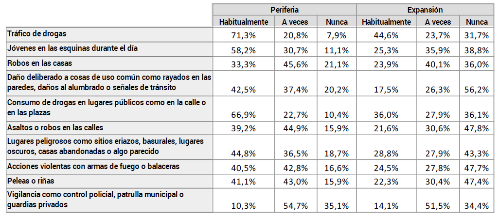 En concordancia con la observación episódica, la percepción de problemáticas asociadas a la seguridad es mucho más fuerte en los conjuntos de la periferia consolidada que en los de las zonas de expansión (Tabla 1). Si bien en todos los conjuntos se manifiestan preocupaciones en torno a la seguridad, quienes viven en sectores de expansión identifican sus sectores como más tranquilos que los de la periferia.