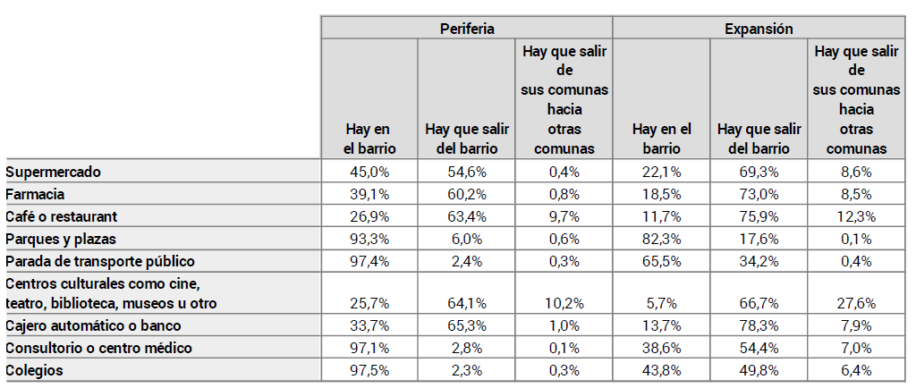 En términos de provisión de equipamiento, en los sectores de expansión se perciben menores niveles de equipamiento y servicios en la escala barrio (en comparación con la evaluación hecha por quienes residen en la periferia consolidada, Tabla 2), y cuando se reconoce que existe, se los evalúa como de menor calidad.