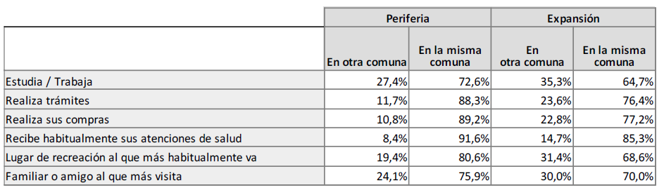 Entre aquellos habitantes de zonas de expansión que tienen vínculo cotidiano con la ciudad, muchos no viajan diariamente al centro de la ciudad, sino a comunas más cercanas a la propia (un ejemplo es la relación entre Padre Hurtado y Maipú, localidades ubicadas en la transición entre la periferia y el extra-radio de la AMGS).