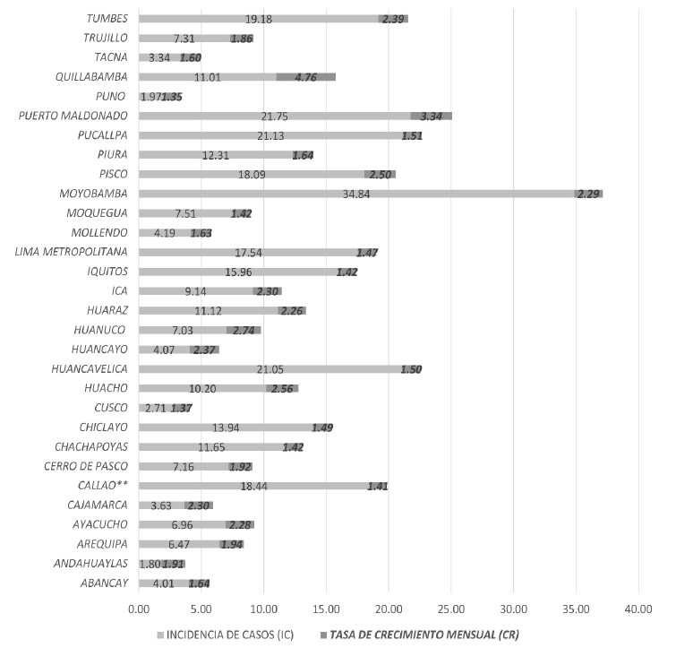El análisis comparativo inició con la elección de dos variables independientes, relacionadas con el nivel de contagio del virus SARS-CoV-2 y su consecuente manifestación en cuadros de COVID-19. Se trata de la incidencia de casos (IC), entendida como el número de contagios por cada 1,000 habitantes, y de la tasa de crecimiento de casos (CR), cuantificada entre el 01 de junio y el 01 de julio[4] de 2020 (Figuras 1 y 2). Ambas estadísticas se obtuvieron de los datos abiertos del Ministerio de Salud del Gobierno del Perú (MINSA), actualizados el 04 de julio del 2020. Se ha de subrayar que, en ambos casos, los niveles de desagregación de la muestra corresponden a las escalas de región y ciudad.