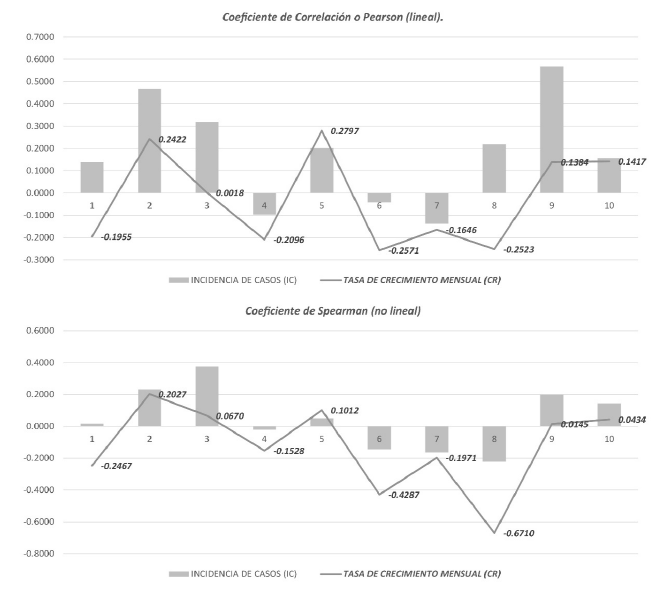 El presente estudio no encontró correlaciones bivariantes perfectas (Figura 3), es decir, los vínculos entre variables no fueron estadísticamente concluyentes; sin embargo, destacan numerosas correlaciones significativamente distintas de cero, que advierten cierta concomitancia entre las condiciones urbanas y el contagio de COVID-19. Por razones metodológicas el trabajo estableció dos valores mínimos, de 0.4 y -0.4, para aplicar como valores referenciales mínimos y máximos de los coeficientes calculados previamente. Esto con la intención de simplificar y hacer lógico el proceso de selección de valores significativos, que denotarían reciprocidad entre las variables estudiadas.