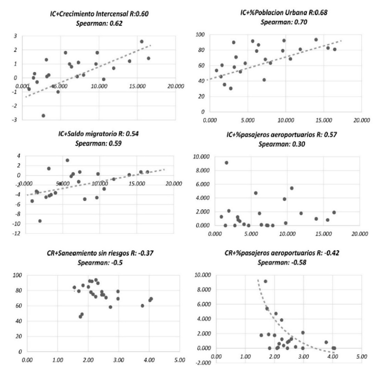 Posteriormente, se eligieron los indicadores urbanos para cada una de las escalas; finalmente, se calculó el nivel de correlación por medio de coeficientes simples bivariantes como la covarianza, el coeficiente de Pearson (R) y el coeficiente de Spearman (S). Se ha de aclarar que la selección de estos coeficientes respondió a la necesidad de abarcar diversas posibilidades de relación: a nivel de interno, a nivel lineal y no-lineal, respectivamente.