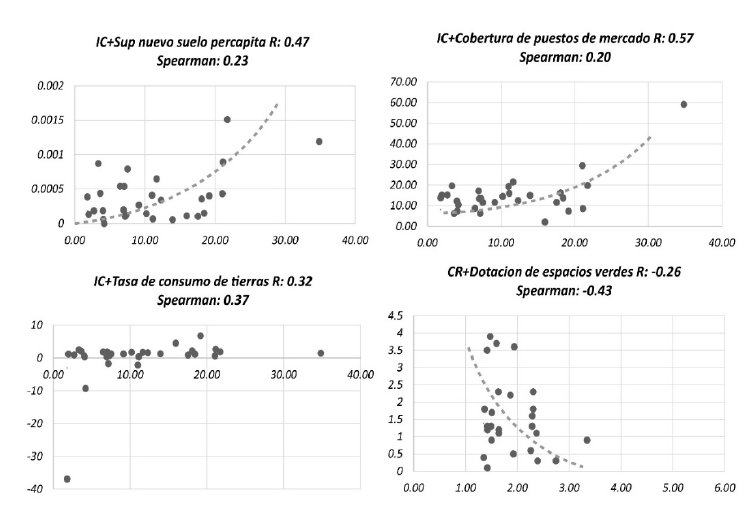 En esta escala de estudio, se encontraron relaciones entre el número de casos (IC), el nuevo suelo urbano per cápita y el coeficiente de consumo de tierras (Figura 5); se confirmaron los supuestos que vinculan la actual emergencia sanitaria con el crecimiento acelerado de las áreas urbanas. Los resultados ponen bajo juicio la superficie urbana con respecto al número de habitantes de la misma, relación que en el caso peruano muestra severos desequilibrios. A saber, en la mayoría de ciudades estudiadas se evidencia un crecimiento artificial o especulativo del suelo, que no es proporcional al crecimiento demográfico (Zucchetti & Freundt, 2019). Por otro lado, se ha de mencionar que existe una fuerte ligazón del ritmo de contagio (CR) y la dotación de equipamiento urbano, en el caso específico de los mercados de abastos, pues se demostró que un número pequeño de puestos de abastos, aumenta las probabilidades de contagio del virus. Dicha explicación es estrictamente analítica, pues no toma en cuenta su distribución en el espacio urbano ni las implicaciones de desplazamiento de personas, factores que, de tomarse en cuenta, aumentarían su influencia y explicarían mejor sus alcances.
