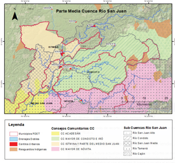 La firma del Acuerdo de Paz entre el Gobierno Nacional y las FuerzasArmadas Revolucionarias de Colombia -FARC-, en diciembre de 2016,implicó la priorización de la acción pública en las regiones más afectadaspor problemáticas socioeconómicas y más impactadas por el conflictoarmado. En este sentido, los municipios de Condoto, Istmina y MedioSan Juan, pertenecientes a la cuenca media del río San Juan, fueron seleccionadospara la ejecución de proyectos de inversión social en sus jurisdicciones,a través de la implementación de Planes de Desarrollo conEnfoque Territorial PDET[2].