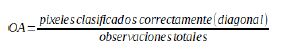 La exactitud global (OA) se genera a partir de matrices de confusión y se define como el número de pixeles clasificados correctamente, divido por el número total de pixeles de referencia (Renza et al., 2017).