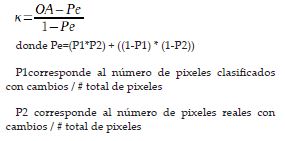 El índice κ es una medida estadística que muestra la concordancia de la exactitud medida entre observaciones y una medida realizada aleatoriamente (Renza et al., 2017). Se define como se muestra en la siguiente ecuación:Además de evaluar la exactitud temática, se verifica la clasificación tomando como referencia las imágenes Ikonos, Rapideye y PlanetScope, así como el orfotomosaico del año 2016 del área urbana de Tunja. Si la validación no es conforme, se debe regresar a la etapa de procesamiento, revisando y reintentando el proceso iterativamente, hasta alcanzar el umbral de validación requerido.