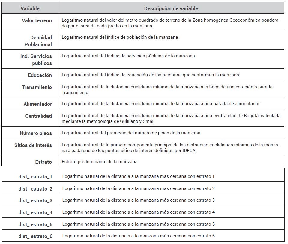 Para estimar un modelo de precios del suelo de Bogotá, se utilizó la información cartográfica del Distrito Capital, disponible en la Infraestructura de Datos Espaciales de Bogotá (IDECA), la información de estratificación y de población de la Secretaría Distrital de Planeación (SDP) y la información de Zonas Homogéneas Geoeconómicas de la Unidad Administrativa Especial de Catastro (UAECD). Se utilizaron 16 variables, que van desde aspectos físicos y espaciales hasta condiciones socioeconómicas. Las variables utilizadas en el modelo se pueden evidenciar en la Tabla 1