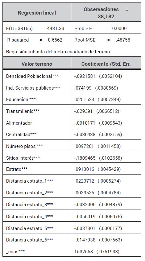 Fuente: Elaboración propia.Al estimar el modelo del valor del metro cuadrado de terreno se encontró que las manzanas con altas densidades de población tienen menores precios del suelo y que las manzanas con mayor cobertura de servicios públicos, mayor número de pisos y de estrato alto, tienen precios del suelo más altos.