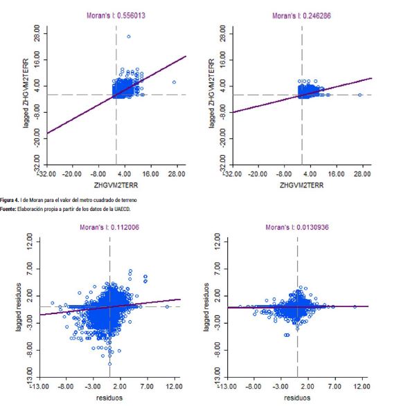 Los resultados obtenidos (Figura 4) muestran, tanto en la parte izquierda (indicador calculado con orden de contigüidad de 1) como en la parte derecha (indicador calculado con orden de contigüidad de 5), la presencia de autocorrelación espacial en el valor del metro cuadrado. Esto cumple con la ley de la geografía descrita por Tobler (1970), que indica que “todas las cosas están relacionadas entre sí, pero las cosas más próximas en el espacio tienen una relación mayor que las distantes” (p. 236). Para el caso del metro cuadrado de terreno, encontramos una autocorrelación positiva, concluyendo, como se explicó anteriormente, que los valores altos de precios del suelo en la ciudad se encuentran en proximidad de lugares con precios de suelo altos.